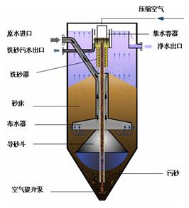 活性砂過濾器基于逆流原理,待處理的原水通過進水管進入過濾器內(nèi)部,經(jīng)底部布水器均勻分配后向上逆流通過濾床,過濾后的濾液在過濾器頂部匯集后溢流排出過濾器系統(tǒng)。 在空壓機的作用下,空氣提升泵將過濾器底層被污染的臟砂提升至過濾器頂部的洗砂器中,通過水流的紊流作用將砂表面的污染物分離出。清洗后的凈砂利用自重返回到砂床中,而清洗砂所產(chǎn)生的污水從過濾器的排污口排出。