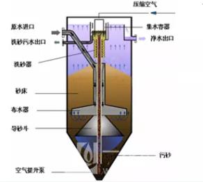 1. 活性砂濾池 1.1 工藝概況 活性砂過濾器是一種集絮凝、澄清、過濾為一體的連續過濾設備,廣泛應用于飲用水、工業用水、污水深度處理及中水回用處理領域。系統采用升流式流動床過濾原理和單一均質濾料,過濾與洗砂同時進行,能夠24小時連續自動運行,巧妙的提砂和洗砂結構代替了傳統大功率反沖洗系統,能耗極低,其工作原理如圖所示。