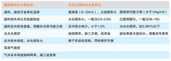 翻板閥濾池采用閉閥沖洗方式,沖洗過程分為:氣沖+氣水聯沖+單獨水沖,無論氣水沖還是水沖,都不向外排水,整個反沖洗階段結束后,靜止數十秒后再排水,因此翻板閥濾池基本不會出現濾料流失現象。 反向過濾池 翻板濾池可以設計成底部進水,上部出水的方式,稱為反向過濾池(上向流過濾池)。沿著過濾水流的方向,顆粒濾料的粒徑由粗到細,這樣一來,水中懸浮物在濾床中的穿透深度變大,極大的提高了濾料層的納污能力,減緩了濾料層水頭損失的增長速度,延長了濾池的工作周期,更接近理想過濾狀態,是當代成熟的顆粒過濾池技術,在濾池改造及新建項目中廣泛采用。