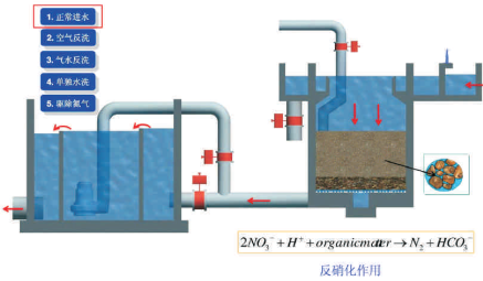 SS極好的去除構筑物,過濾中,硝態氮通過微生物膜的作用轉化為氮氣排出,懸浮物不斷的被截留會增加水頭損失,因此需要反沖洗來去除截留的固體物。最后達到一個構筑物具有脫氮、除磷和去除懸浮物的功能。